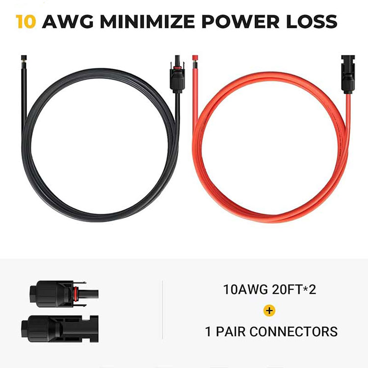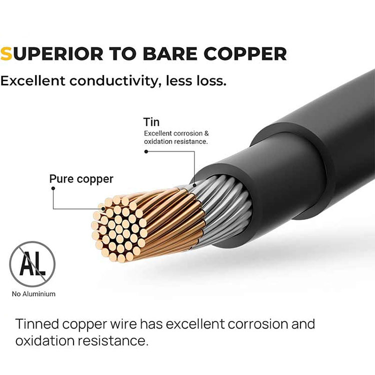 Gbe Ipadanu Agbara Mu: Ti a ṣe pẹlu afọwọkọ funfun ti a bo, okun cooper funfun ti a bo tinned ni o ni itanna eletiriki to dara, ni akawe pẹlu okun waya Ejò igboro, resistance ipata rẹ ati iṣẹ ṣiṣe ifoyina ni okun sii, tun le fa igbesi aye iṣẹ ti awọn kebulu pọ si. Ti a ṣe afiwe pẹlu awọn kebulu 14AWG ati 12AWG, lilo okun itẹsiwaju oorun 10AWG le dinku pipadanu agbara ninu eto nronu oorun rẹ.