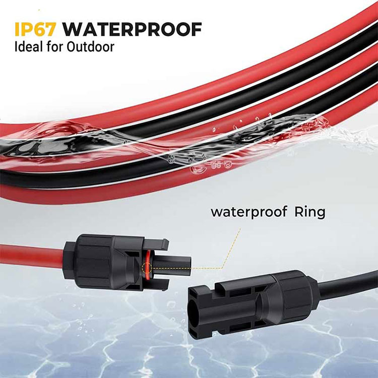 Mabomire ati Ti o tọ: Iwọn omi IP67 kan lori asopo oorun ọkunrin jẹ pipe fun lilẹ omi ati eruku lati ṣe idiwọ ibajẹ. Asopọmọra jẹ iduroṣinṣin ati ailewu pẹlu titiipa ti a ṣe sinu, eyiti o tọ ni ita. Okun PV jẹ apẹrẹ lati koju ooru pupọ ati otutu.